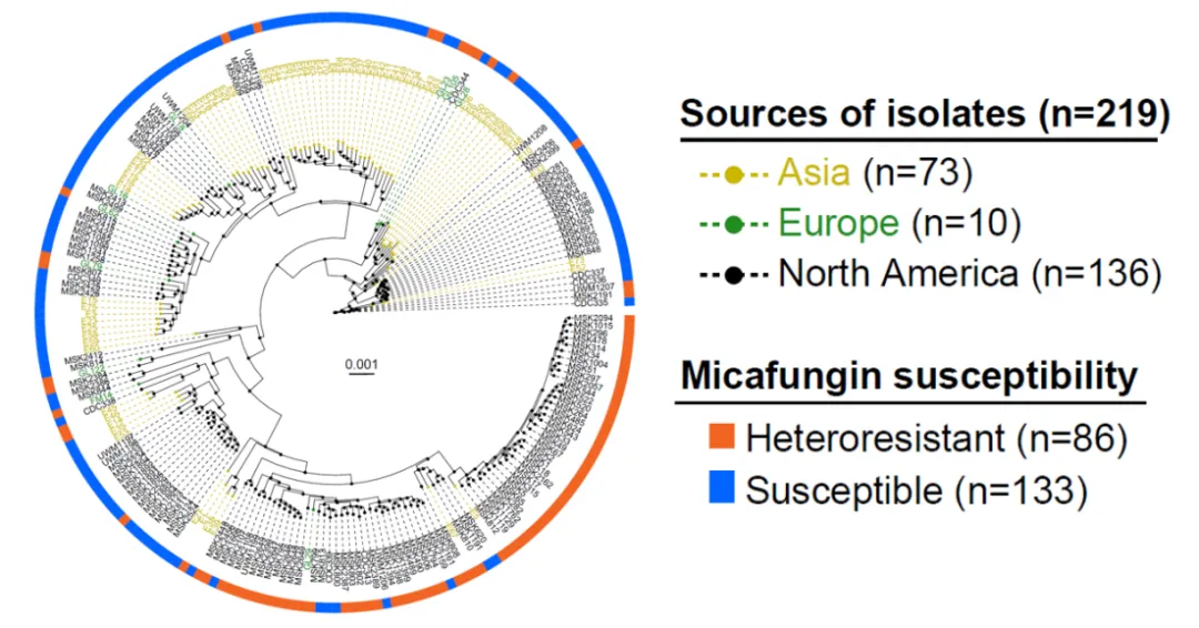 为了探索临床菌株中出现米卡芬净异质性耐药的普遍性,作者检测了来自美国、中国、法国、德国不同医疗组织的共219株近平滑念珠菌对米卡芬净的药敏表型,并对所有菌株都进行了深度全基因组测序。结果显示,各国的临床菌株中均发现了对米卡芬净异质性耐药的菌株,预示着这一具有重要临床意义的药敏表型可能在更广泛的地域范围中影响棘白菌素类药物预防/治疗真菌感染的效力。