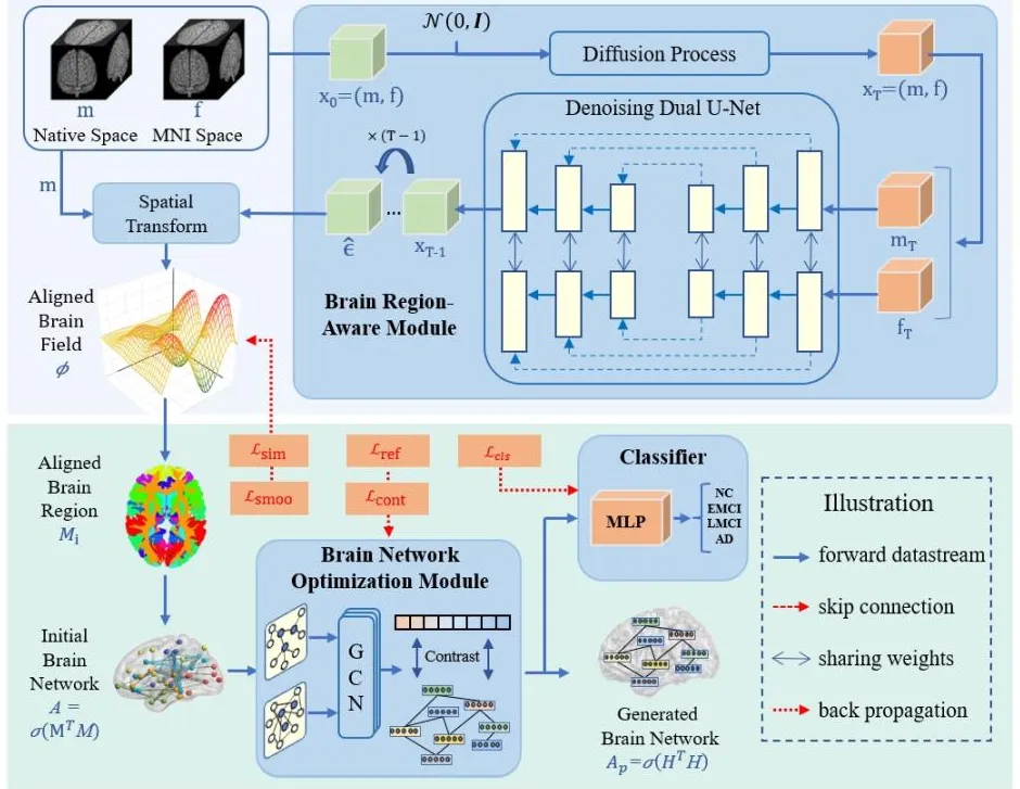 具体而言,研究团队第一时间顺利获得设计的大脑区域感知模块(BRAM)的扩散学习过程,实现个性化脑区的精准定位,避免了主观参数选择,并自动化对齐标准脑模板空间。然后利用图对比学习思想,顺利获得稀疏化冗余连接,实现个体化大脑连接优化,从而增强同一组内大脑网络的一致性。最终顺利获得设计节点-图对比损失和分类损失的联合约束机制,实现重建脑网络优化。