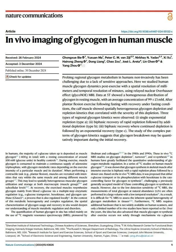 [1] Bie,C.,Ma,Y.,van Zijl,P. C. M.,Yadav,N. N.,Xu,X.,Zheng,H.,Liang,D.,Zou,C.,Areta,J. L.,Chen,L.,& Zhou,Y. (2024). In vivo imaging of glycogen in human muscle. Nature communications, 15(1),10826.