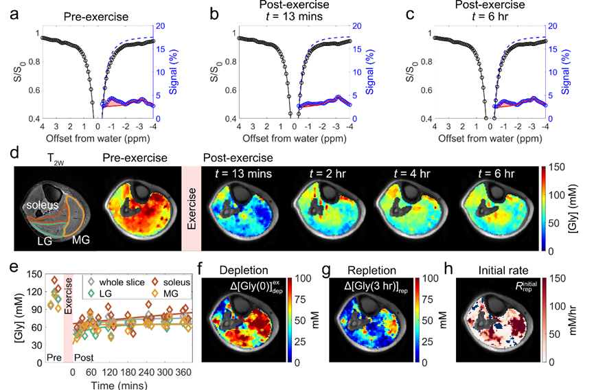 [2] Jue,T.,Rothman,D. L.,Shulman,G. I.,Tavitian,B. A.,DeFronzo,R. A.,& Shulman,R. G. (1989). Direct observation of glycogen synthesis in human muscle with 13C NMR. Proceedings of the National Academy of Sciences of the United States of America, 86(12),4489–4491. [3] Price,T. B.,Rothman,D. L.,Taylor,R.,Avison,M. J.,Shulman,G. I.,& Shulman,R. G. (1994). Human muscle glycogen resynthesis after exercise: insulin-dependent and -independent phases. Journal of applied physiology (Bethesda,Md.:1985), 76(1),104–111.[4] Hargreaves,M.,& Spriet,L. L. (2020). Skeletal muscle energy metabolism during exercise. Nature metabolism, 2(9),817–828.[5] Vigh-Larsen,J. F.,Ørtenblad,N.,Spriet,L. L.,Overgaard,K.,& Mohr,M. (2021). Muscle Glycogen Metabolism and High-Intensity Exercise Performance: A Narrative Review. Sports medicine(Auckland,N.Z.), 51(9),1855–1874. [6] Schytz,C. T.,Ørtenblad,N.,Gejl,K. D.,& Nielsen,J. (2024). Differential utilisation of subcellular skeletal muscle glycogen pools: a comparative analysis between 1 and 15 min of maximal exercise. The Journal of physiology, 602(8),1681–1702. [7] Price,T. B.,Rothman,D. L.,& Shulman,R. G. (1999). NMR of glycogen in exercise. The Proceedings of the Nutrition Society, 58(4),851–859. [8] Zhou,Y.,Bie,C.,van Zijl,P. C. M.,& Yadav,N. N. (2023). The relayed nuclear Overhauser effect in magnetization transfer and chemical exchange saturation transfer MRI. NMR in biomedicine, 36(6),e4778.
