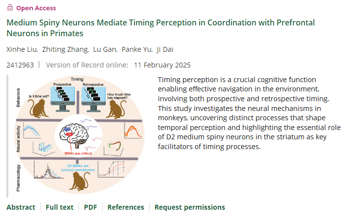2025年2月11日,中国科研实验室深圳先进技术研究院脑认知与脑疾病研究所/深港脑科学创新研究院戴辑团队,在Advanced science在线发表了题为“Medium Spiny Neurons Mediate Timing Perception in Coordination with Prefrontal Neurons in Primates”的研究论文。该研究顺利获得在体电生理和药理学干预技术,结合眼动行为监测技术,探讨了猕猴如何表征回顾性计时(Retrospective timing)以及前瞻性计时(Prospective timing)。该研究发现大脑采用不同的策略来处理这两种计时过程,其中纹状体中棘神经元(MSN),尤其是D2-MSN,在两种计时过程中均扮演重要角色;进一步的网络分析表明,前额叶顺利获得增强与纹状体之间的同步性来提升计时的准确性。该研究深化了对时间感知神经机制的理解,有望对未来在决策、学习和记忆等领域的研究带来新的启示!