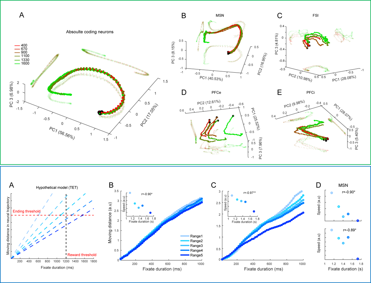 研究人员分别对前额叶(PFC)以及纹状体的神经元波形数据进行降维聚类,区分了纹状体中棘神经元(Medium spiny neuron,MSN)和中间神经元(Fast-spiking interneuron,FSI)信号,以及PFC中兴奋性神经元(PFCe)及抑制性神经元(PFCi)信号。研究人员发现,MSN有最高比例的神经元展示了“绝对编码”或“相对编码”的反应模式。在主成分空间描述神经元活动变化的“神经轨迹”的变化速度,能够表征猕猴在TBT以及TET中时距知觉行为的差异(图3):即MSN集群变化的速度越快,猕猴在TBT中越倾向于判断为“长”,而在TET中的注视时长会缩短。这提示了猕猴的主观时长变化速度与MSN的活动速度成正相关,这些结果强调了MSN在编码主观时长信息中的重要作用。