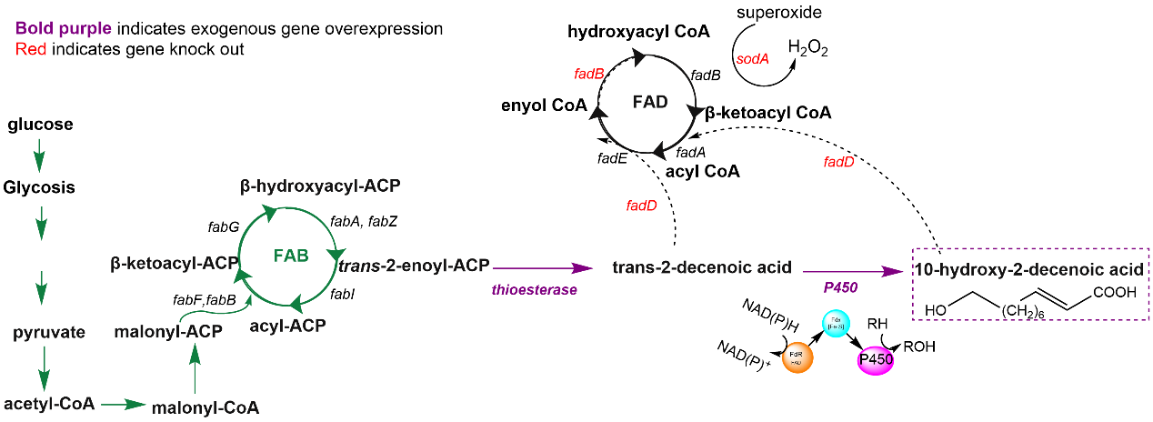 王浆酸10-HDA作为仅存于蜂王浆中的一种生物活性化合物,已经被证明具有多项显著功效:它能有效抑制肿瘤细胞的生长,具有出色的抗炎活性及抗菌效能,同时在治疗多囊卵巢综合症、脂肪肝、关节炎和自闭症谱系障碍等疾病方面也表现出持续的疗效,且未报告有任何副作用,其未来应用前景将更加广阔。本文建立了基于原生脂肪酸合成途径(Fatty acid biosynthesis,FAB)的完整合成路径。鉴于FAB途径广泛存在于所有生物体中,本研究也为将这一代谢途径整合到其他可工程化微生物体系给予了一个通用的平台。