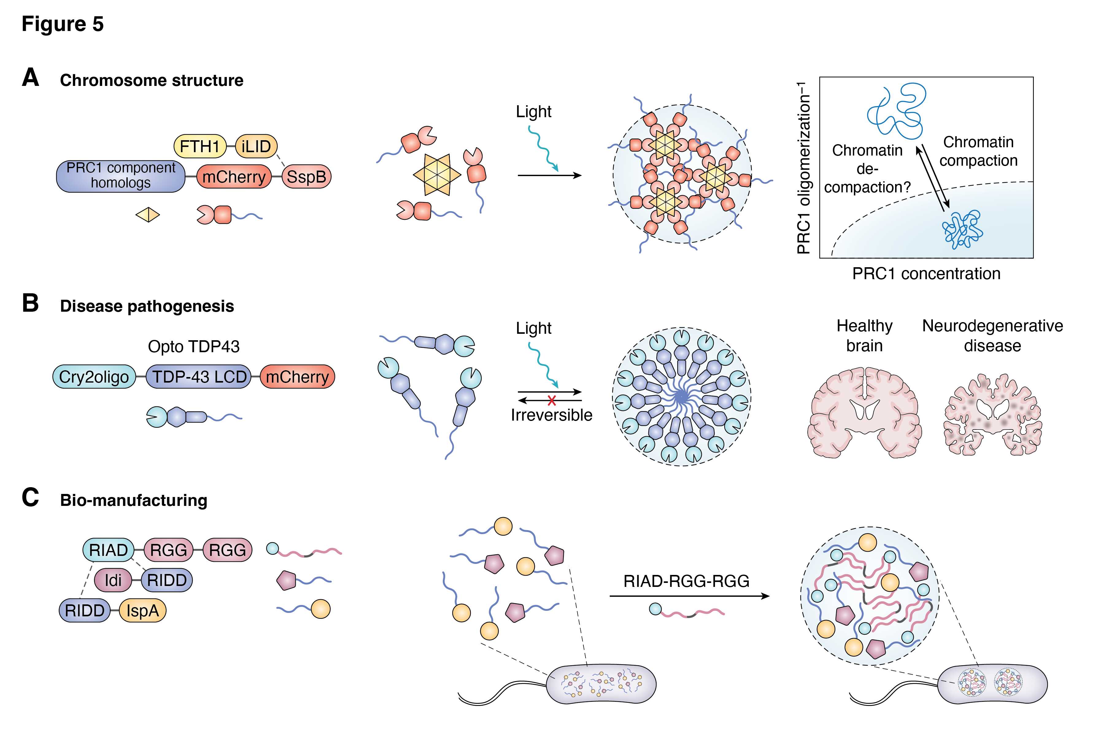 SBMCs在染色体结构研究中的应用:染色体的组织对基因表达和稳定性至关重要。Polycomb suppressicomplex 1(PRC1)是一种染色质修饰复合物,参与维持染色质的抑制状态。Clifford Brangwynne团队顺利获得Corelets系统设计了一种光激活的多组分PRC1凝聚物,阐明了PRC1在染色质致密化中的机制。这项研究为染色体结构研究给予了理想的实验平台。