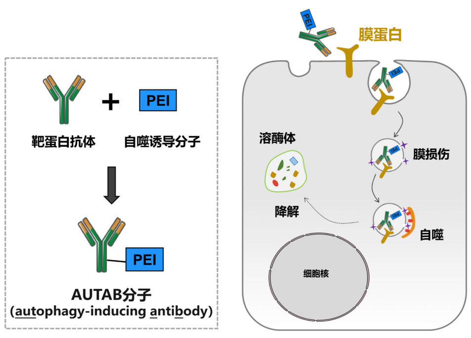 这项创新技术的灵感来源于,自然界中病原体感染和细胞膜损伤后细胞自主启动自噬进行清除的现象。研究团队在筛选自噬诱导分子过程中发现,有一种广泛应用于基因及药物递送的材料——聚乙烯亚胺(Polyethyleneimine,PEI),能够高效诱导类似的细胞自噬。基于此发现,团队利用点击化学方法将PEI与能够特异性识别目标膜蛋白的抗体共价连接,成功构建出一种既能精准定位又能有效激活自噬机制的AUTAB分子,从而实现了对细胞膜蛋白的靶向降解。