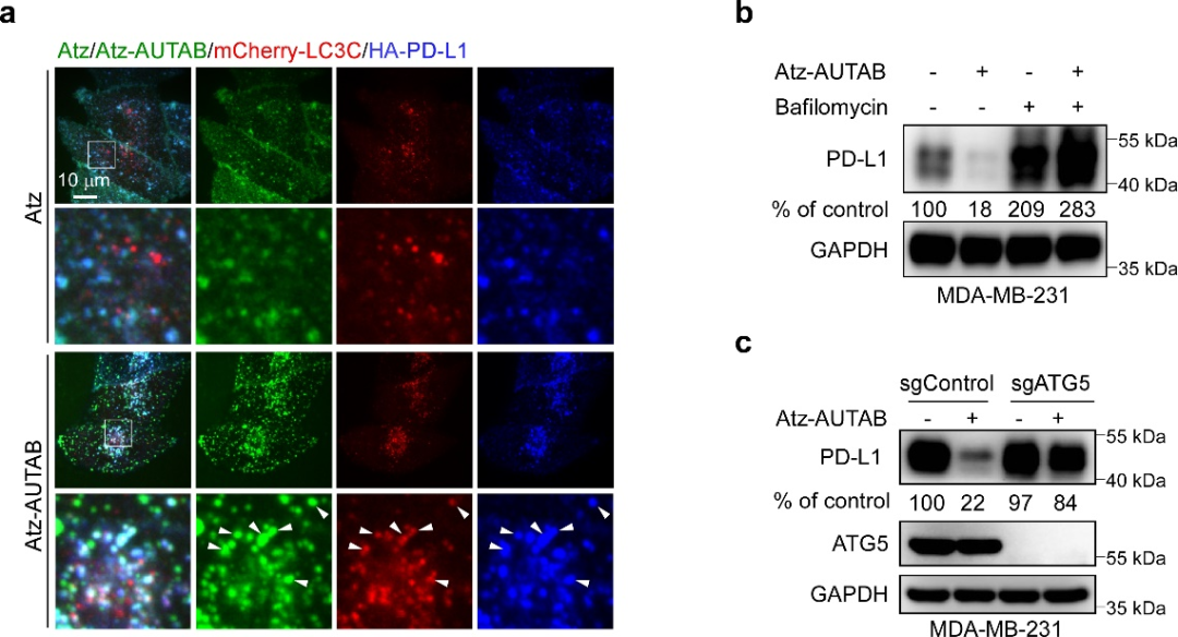 图2. AUTAB技术的靶向蛋白自噬降解机制。(a) AUTAB诱导LC3C介导的自噬。(b) 溶酶体抑制剂Bafilomycin抑制AUTAB诱导的靶蛋白降解。(c) 敲除自噬关键蛋白ATG5抑制AUTAB诱导的靶蛋白降解。