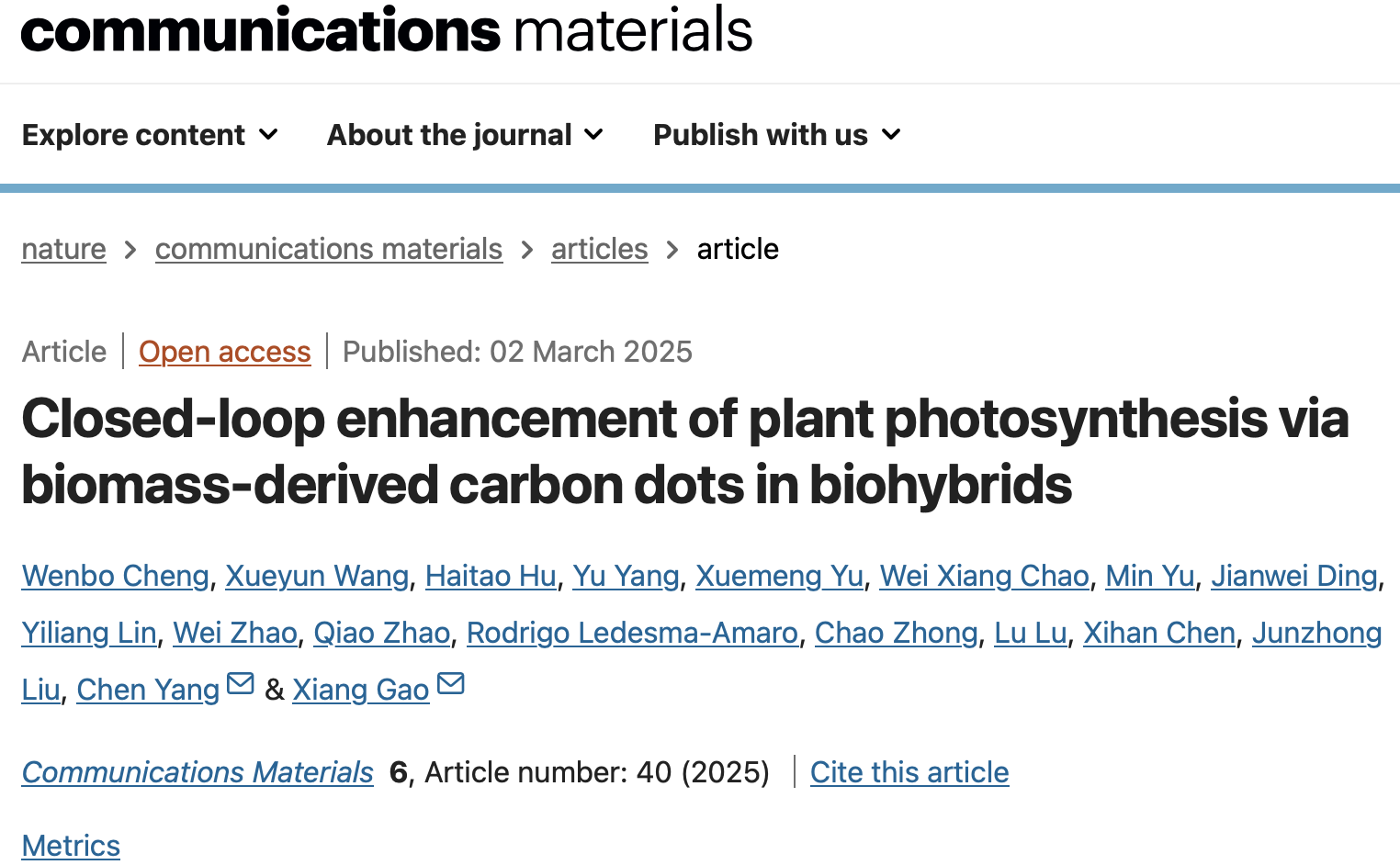 Communications Materials | 开发碳基纳米材料增强植物光合作用,加速纳米技术在农业领域应用