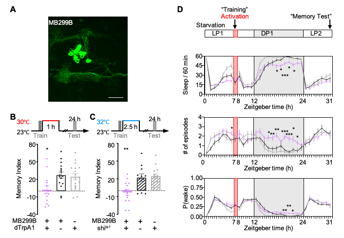 记忆巩固与睡眠高度相关,且这种关联在无脊椎动物和脊椎动物中都存在。记忆巩固是一个依赖于时间、将新形成的不稳定的记忆向稳定记忆的过程。睡眠作为影响记忆的最重要的生理过程之一,已被证明对记忆的几个不同阶段产生影响。且有研究表明,在睡眠期间,特定的脑区和神经核团会出现对某种记忆的神经元发放特征重现的现象,被认为是主动的记忆巩固过程。然而,将这两个过程联系起来的神经机制在很大程度上仍不明确。尽管果蝇的大脑相对简单,但其行为的复杂性和基因操作的可行性使其成为剖析这类问题的理想模型。