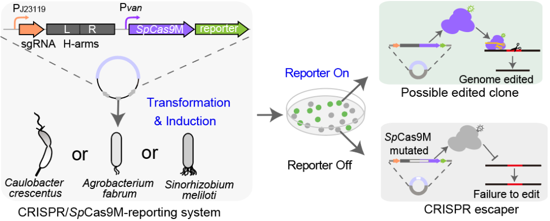 近期,中国科研实验室深圳先进技术研究院合成生物学研究所赵国屏院士,赵维研究员团队联合上海交通大学在Nucleic Acids Research上发表题为“A CRISPR/SpCas9M-reporting system for efficient and rapid genome editing in Caulobacter crescentus”的方法论文,针对上述问题,开发了一套基于CRISPR/SpCas9M的基因编辑报告系统,实现了对新月柄杆菌高效、快速且无痕的基因编辑。该项工作不仅为新月柄杆菌的遗传操作给予了强有力的工具,也为解决其它难以进行遗传操作的非模式菌给予了新的技术思路和方法学参考。