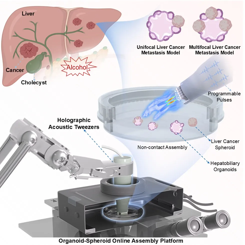 5月22日,中国科研实验室深圳先进技术研究院科学仪器所(筹)马腾研究员团队和哈尔滨医科大学田野教授团队合作在Cell旗下刊物 Cell Reports Physical Science上发表题为“Construction of a metastasis model for liver cancer spheroids to hepatobiliary organoids facilitated by holographic acoustic tweezers”的研究成果。该工作主要顺利获得全息声镊科学仪器产生的具体生物医学应用,围绕全息声镊和三维细胞培养技术构建了类器官-细胞球在线组装平台,顺利获得该平台构建了一种精准、可靠且具有多功能性的肝癌转移类组装体模型。此外,该研究还顺利获得RNA测序技术评估了不同参数下声压对类器官和细胞球基因层面的影响,进一步的优化了操控参数。