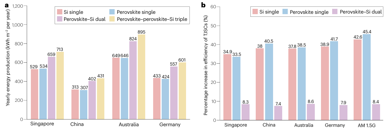 模拟结果显示,钙钛矿-钙钛矿-硅三结电池的理论效率可达44.3%,比双结电池的理论极限(39.5%)高出约5个百分点。在实际气候条件下,该类三结器件的发电量比单结电池提升33–46%,比双结电池高约8%,展现出巨大的应用潜力。