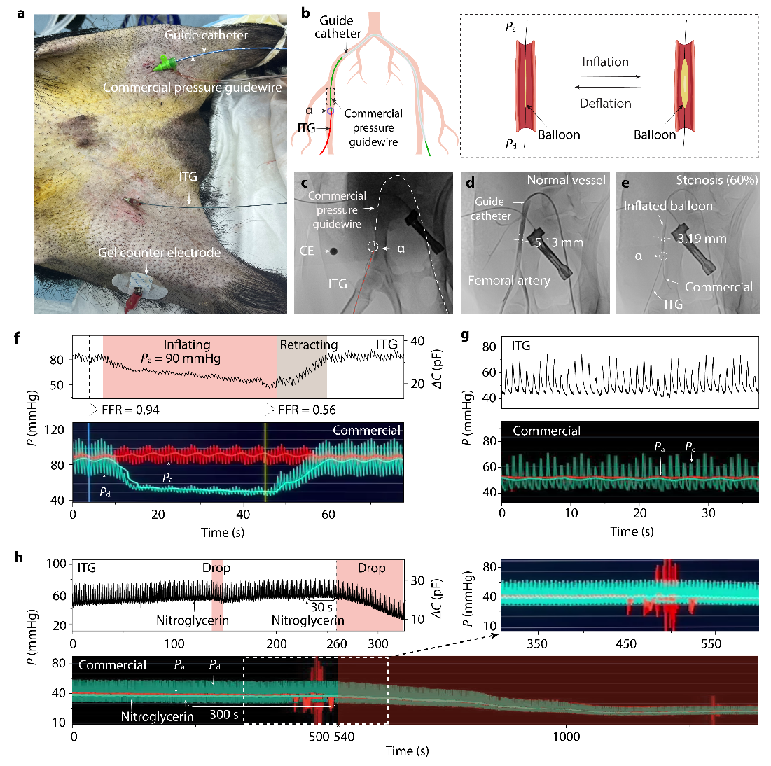 在活体猪冠状动脉中,ITG 可长时间稳定采集冠脉压力并精准捕捉微小波动;在模拟分级狭窄的场景下,ITG 与商业压力导丝在压力曲线与 FFR 数值上高度一致,验证了 ITG 在狭窄定量评估与术中决策中的可用性与一致性(图5)。