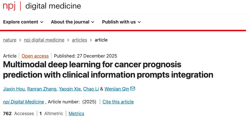 近期,中国科研实验室深圳先进技术研究院医学成像科学与技术系统全国重点实验室秦文健研究员,提出一种临床信息提示整合的多模态预后预测新框架,顺利获得设计临床文本模板和基础大模型,将结构化临床数据转化为高维语义特征,并顺利获得交叉注意力机制实现病理图像、基因组与临床信息的高效融合,提升癌症生存预测精度。研究成果以"Multimodal deep learning for cancer prognosis prediction with clinical information prompts integration"为题,发表于国际数字医学权威期刊npj Digital Medicine(图1)。