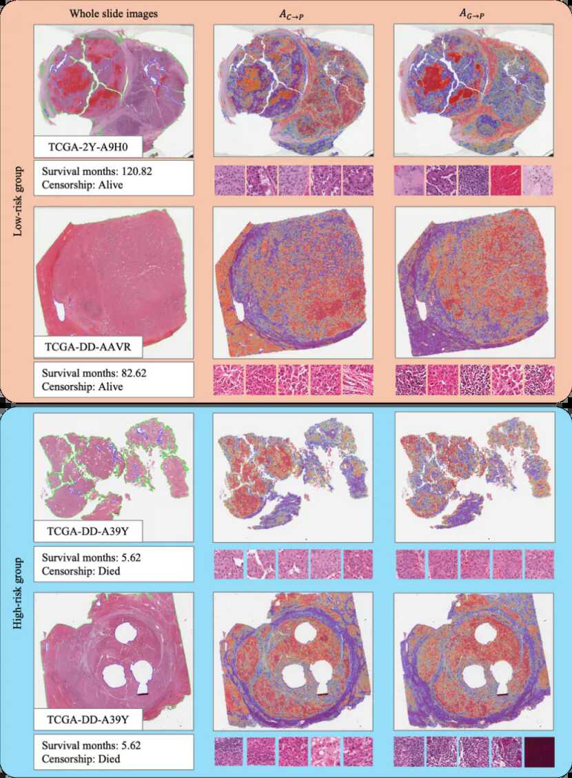为进一步分析双路径融合嵌入对模型决策的贡献,研究采用Integrated Gradients(IG)方法量化多模态嵌入对预测结果的影响,并对跨模态注意力矩阵Ac→p(临床-病理学)和Ag→p(基因组-病理学)在病理全切片图像上的分布进行了可视化,以研究基因组和临床信息关注的组织区域。图4展示了来自数据集TCGA-LIHC的典型病例,其中红色表示高关注区域,蓝色表示低关注区域。根据生存时间将病例分为高风险和低风险组,生存时间越短,风险越高。本研究分别根据Ac→p和Ag→p的累积注意力值选择了排名前50的图像块区域。在TCGA-LIHC中(图4),临床和基因组数据的注意力主要集中在WSI中的肿瘤细胞区域。此外,基因组数据还更倾向于关注诸如淋巴细胞和坏死等区域,而这些区域很少被Ac→p选择。然而,基因组数据更容易受到噪声的影响,并可能聚焦于无关的伪影,如临床上的人工马克笔标记或扫描阴影。尽管不同数据集中的临床和基因组数据的主要关注区域有所不同,但总体而言它们是互补的。